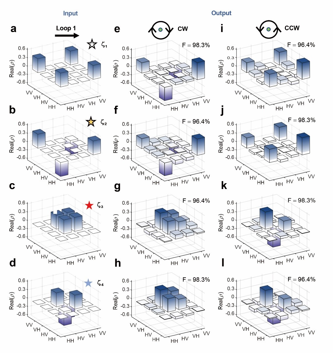 四個輸出態的理論密度矩陣如圖 2 所示。圖 2e-2h 對應的是順時針變化的情況,而圖 2i-2l 對應的是逆時針變化的情況。為便于比較,圖 2a-2d 顯示了輸入狀態的密度矩陣。圖 2a-2d 中的白色、黃色、紅色和藍色星號與圖 1b 中標注的星號相對應,分別代表輸入態