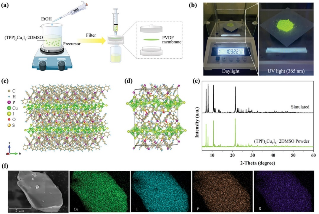 圖1. 反溶劑法合成(TPP)2Cu4I6·2DMSO制備流程示意圖及相關表征