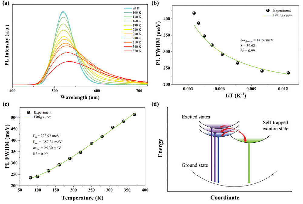通過變溫熒光光譜中半峰寬和對應溫度的擬合,(TPP)2Cu4I6·2DMSO的黃-里斯因子被計算為36.68,表明了其具有較強的電子-聲子耦合作用,且其激子自限時間為290 fs,暗示了超快STE態的形成。其發光機理為:在高能紫外激發下,電子吸收光子能量從基態躍遷到激發態,形成自由激子,由于[Cu4I6]2-多面體的扭曲帶來產生的電子-聲子耦合作用,形成自限態,自由激子被其捕獲,最后通過輻射復合的方式回到基態,產生寬帶綠色發射。圖4. 基于(TPP)2Cu4I6·2DMSO制備的不同白光LED