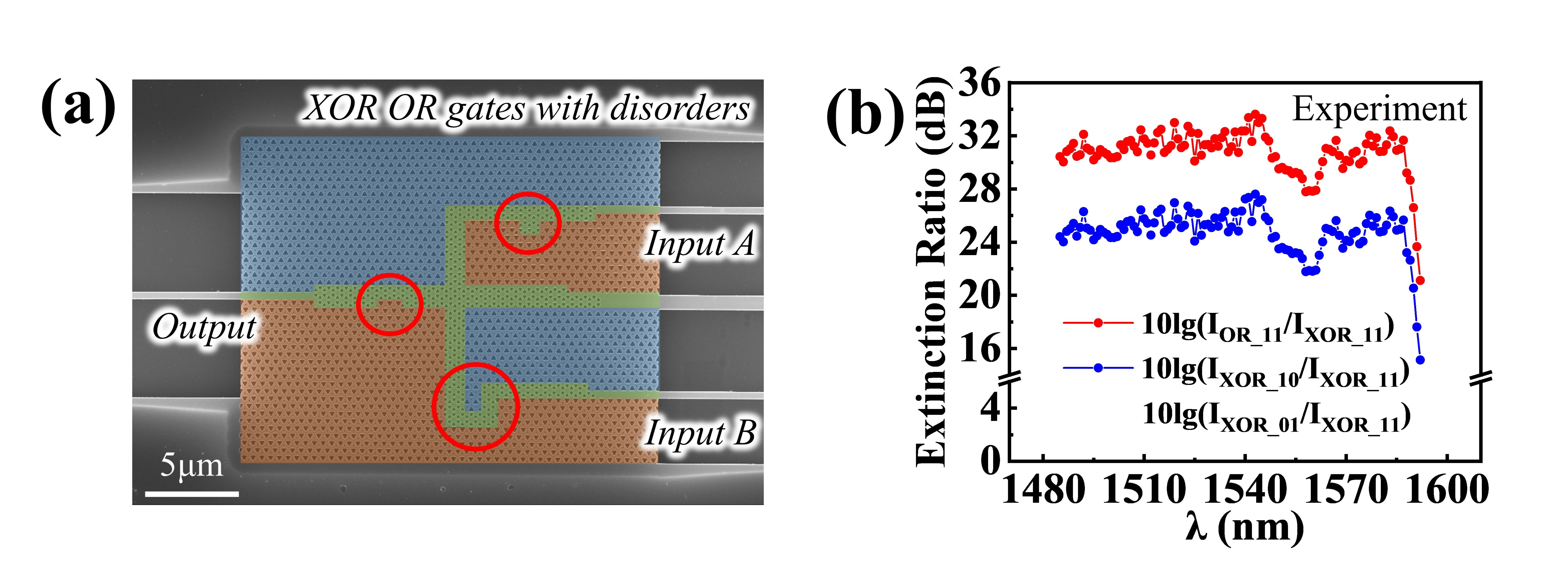 為了進一步實驗證明所制備邏輯器件的魯棒性,研究人員制備了具有三種缺陷的邏輯單元(XOR和OR門),如圖5a的SEM圖像所示。三個紅色圓圈標記了三種不同類型的缺陷。實驗結果(圖5b)表明,這些器件在具有無序擾動的情況下依舊可以保持很高的消光比。