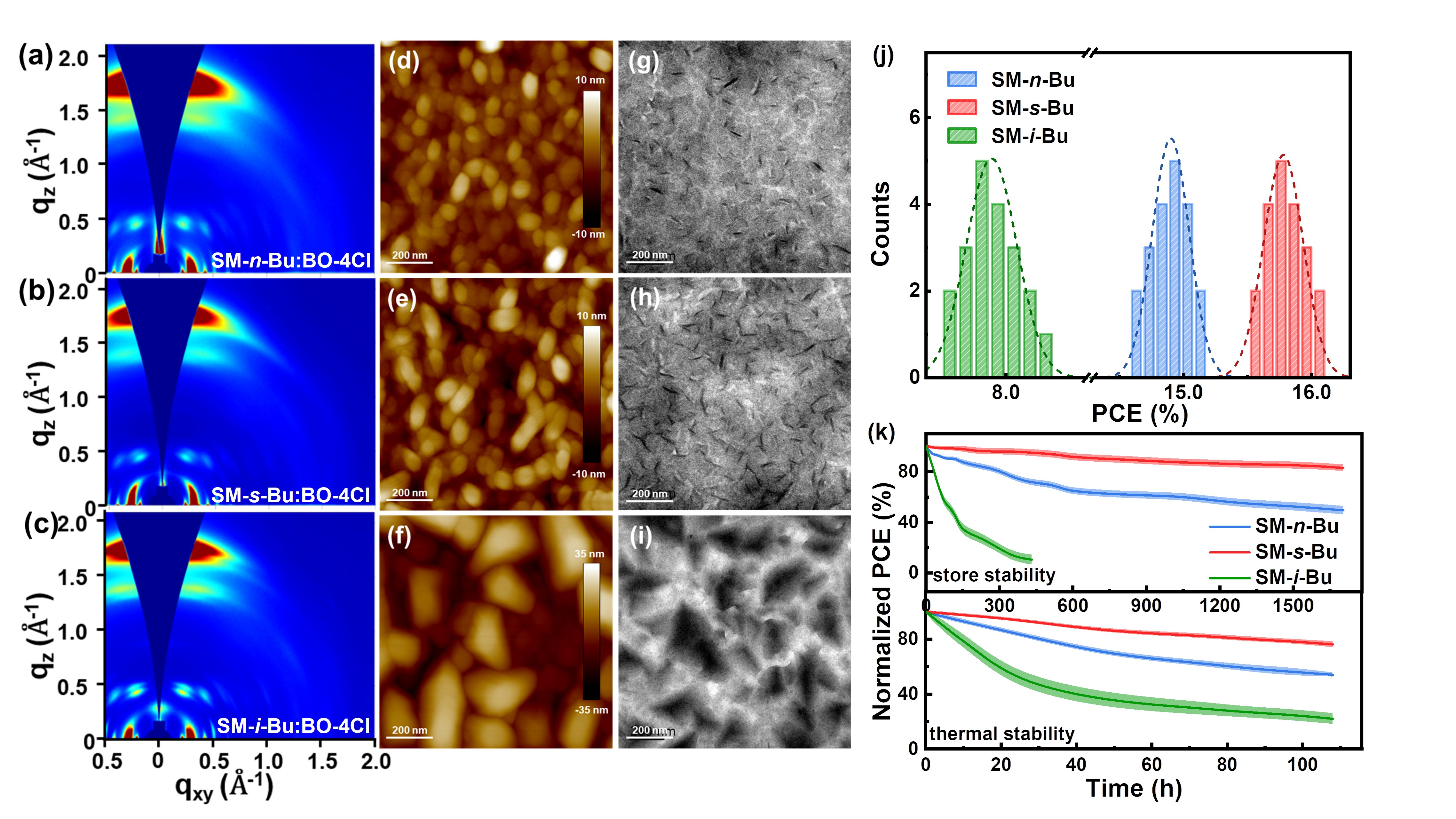 圖2:基于三個異構化小分子給體的共混膜形貌(a-i)以及器件效率(j)以及穩定性(k)對比
