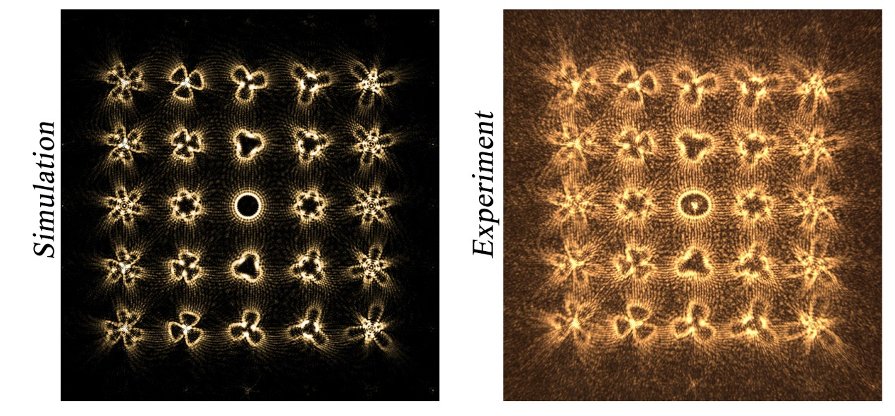 為了利用全光手段實現函數微分和四則運算功能的結合,黃玲玲教授團隊應用廣義渦旋光束的設計方法,結合達曼渦旋優化,通過設置自定義的相位微分基本函數,實現了不同衍射級次的多種微分函數加減運算的直觀光學展現。以三角函數為例,類比于傅里葉級次方法對任意周期函數的展開表達,利用中心基本拓撲荷的相位微分、橫向與縱向相位微分函數變化的結合,實現了不同衍射級次上不同函數特征的分布。并且,根據廣義渦旋光束相位微分與光束形態之間的關聯,不同衍射級次上的各異函數變化呈現為不同的光束輪廓,構成了豐富多樣的陣列圖案,實驗驗證單次同時計算顯示的各異渦旋光束陣列可多達7×7。相比于傳統光計算,該方法實現了函數微分加減運算的直觀圖像化表達,并且這種新型的函數式微分加減計算功能突破了傳統光學計算圍繞特定三角函數數值進行分析的局限。此外,針對單個光束的閉合圓周覆蓋連續自變量范圍以及多個光束之間的微分加減運算關聯都使得光計算擁有更強的靈活性和功能性。