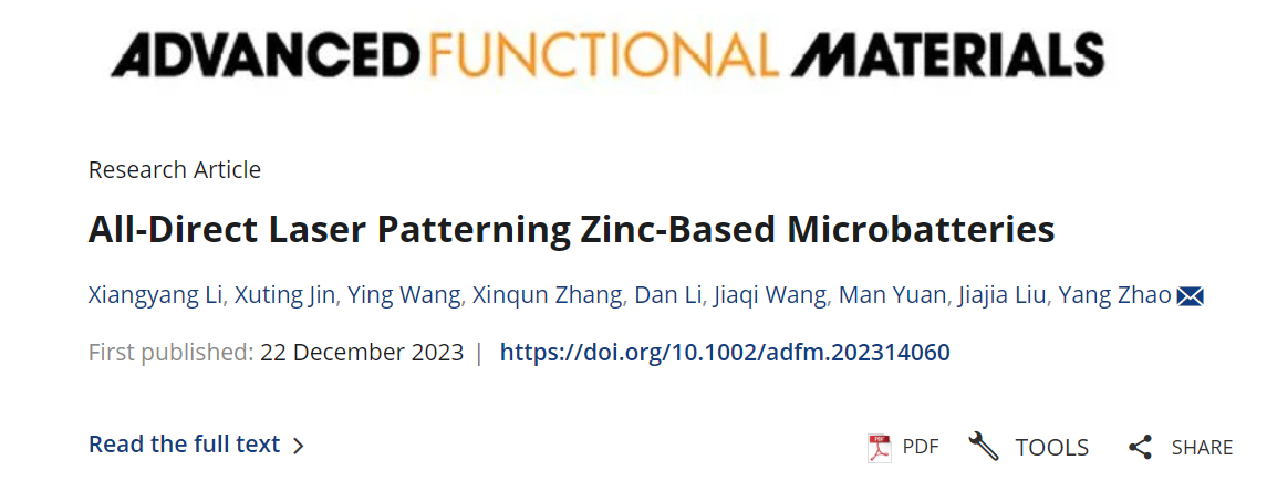 近日,北京理工大學化學與化工學院博士生李向陽第一作者身份在國際頂級期刊《Advanced Functional Materials》發表題目為“All-Direct Laser Patterning Zinc-Based Microbatteries”的研究論文(DOI:10.1002/adfm.202314060)。北京理工大學為論文第一通訊單位,北京理工大學化學與化工學院趙揚特別研究員為通訊作者。