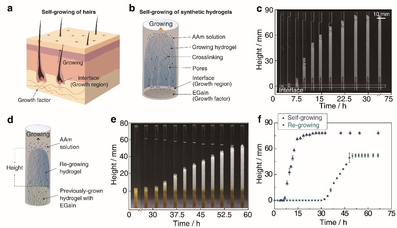 針對這一問題,受角質蛋白自生長行為的啟發,團隊提出了液態金屬(EGaIn)和水性單體丙烯酰胺(AAm)溶液界面處的連續自由基聚合策略,賦予了人工合成聚丙烯酰胺(PAAm)水凝膠材料前所未有的自生長特性(圖1 a-c)。進一步將自生長得到的水凝膠添加到單體溶液中,發現水凝膠表現出連續再生長的特征(圖1 d-f)。