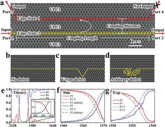 另外,通過繪制超胞的能帶圖(圖1d),可以清楚地看到,在拓撲能隙中出現(xiàn)了兩個邊緣態(tài),它們在K谷具有相反的正負群速度。由于有限尺寸效應,兩個邊緣態(tài)之間出現(xiàn)了打開的能隙,這表明它們之間發(fā)生了耦合。并且兩個邊緣態(tài)模式具有不同的傳播方向,如圖1e所示。利用拓撲邊緣態(tài)的獨特特性,研究人員設計了拓撲反向耦合器(topo-CDC)。這里,topo-CDC由三層拓撲谷光子晶體結(jié)構(gòu)組成。圖2展示了topo-CDC的SEM圖像和理論實驗透射率結(jié)構(gòu)。由于topo-CDC的鏡像對稱性,在端口1和4入射時,端口2和3可以出射任意比例的光。這表明利用topo-CDC可以實現(xiàn)任意分束比的2×2光束分束。