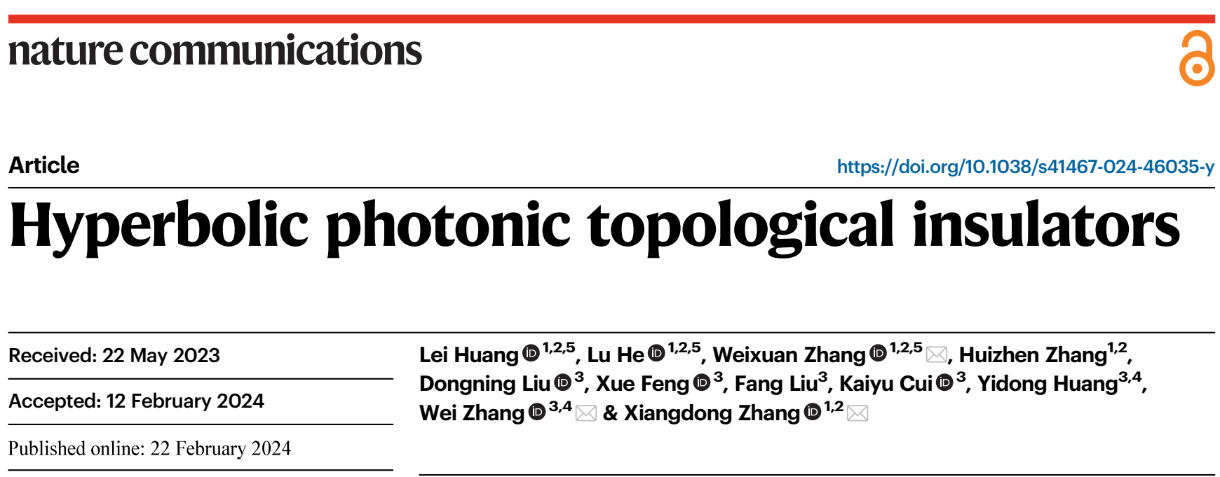 日前,北京理工大學物理學院張向東教授課題組與清華大學電子工程系黃翊東教授課題組合作,在雙曲光拓撲絕緣體研究方面取得重要進展。相關工作發表在Nat. Commun. 15, 1647 (2024)上。研究工作得到國家重點研發計劃,國家自然科學基金和中國科協青年人才托舉工程的資助。北京理工大學物理學院博士生黃磊、何路(現為光電學院特立博士后)和張蔚暄副教授為論文共同第一作者,張向東教授、清華大學張巍教授和張蔚暄副教授為通訊作者。另外,北京理工大學張慧珍副研究員,清華大學劉仿教授、馮雪副教授、崔開宇副教授、劉東寧博士也對此工作做出了貢獻。