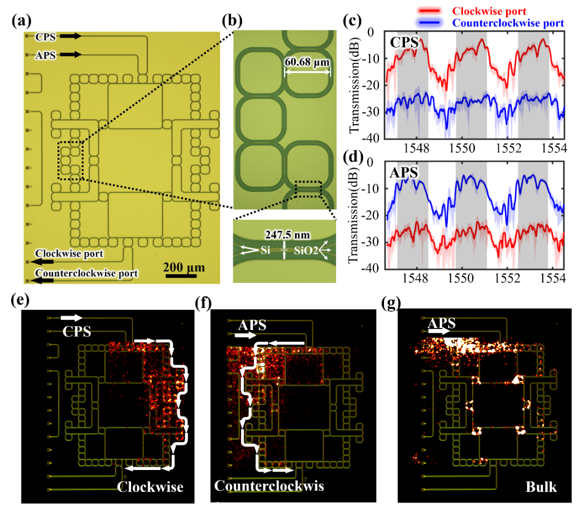 研究人員實現了對雙曲光拓撲絕緣體的實驗驗證。圖3a顯示了由電子束光刻和等離子體蝕刻方法所制備面心雙曲光拓撲絕緣體顯微鏡圖像。研究人員對實驗樣品進行了透射譜和近場分布的測量。在透射譜測量時,研究人員分別在CPS和APS進行激發,分別測量順時針和逆時針輸出端口的信號強度,其結果分別顯示在圖3c和3d中。其中,兩個輸出端口的傳輸信號分別用紅線和藍線表示,陰影區域對應于測量信號的波動范圍。結果表明,當以CPS(APS)入射時,在拓撲邊緣態頻率范圍內,順時針(逆時針)出射端口的透射率遠大于逆時針(順時針)出射端口。而當輸入頻率遠離拓撲邊緣態頻率時,順時針輸出端口的透射率顯著降低,對應于平庸體態的激發。圖3e和3f為1550.7 nm處CPS和APS激發下的近場分布。實驗結果清晰展現了贗自旋選擇的拓撲邊緣傳輸特性。進一步研究人員測量了1551.4 nm激發下的近場分布,如圖3g所示。可以發現,平庸體態得到了激發。上述實驗結果清楚地證明了具有贗自旋選擇特性的雙曲拓撲邊緣態的存在。同樣,研究人員也對體心雙曲光拓撲絕緣體進行了實驗驗證,如圖4所示。