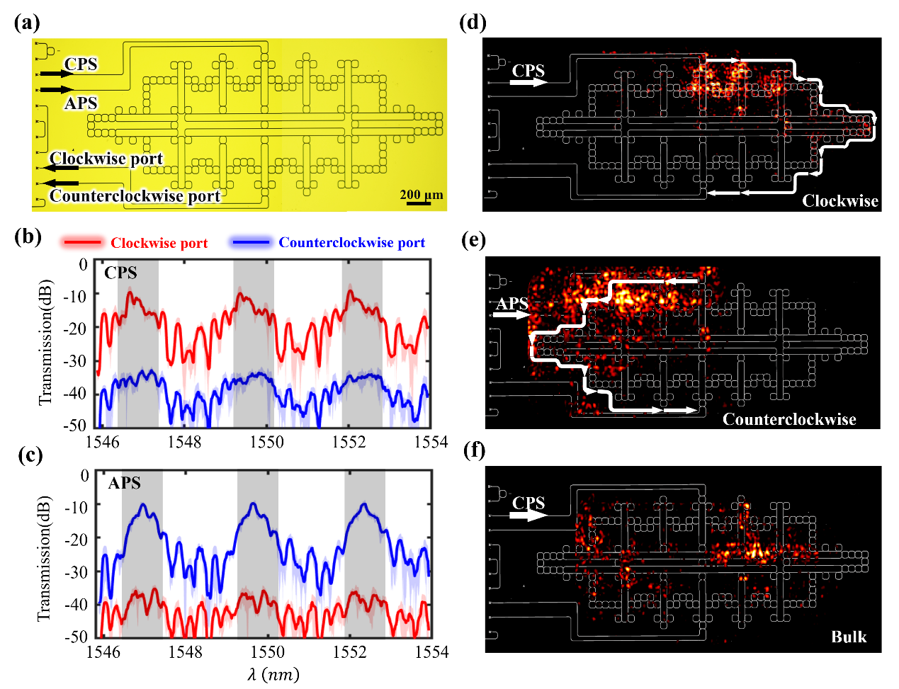 首先,研究人員考慮了龐加萊圓盤上的{6,4}面心雙曲拓撲晶格模型,如圖1a-1c所示。通過引入最近鄰、次近鄰和次次近鄰格點間的復數耦合(一半原包內),可以破壞系統的時間反演對稱性,從而引入非平庸的拓撲性質。圖1d和1e分別顯示了兩種耦合相位下的能譜和實空間陳數計算結果,其中能譜格點的顏色表征相應特征態的邊緣局域化強度。可以看出,在零能附近存在具有非平庸陳數的雙曲邊界態。隨后,研究人員通過設計環形諧振腔的空間排布和耦合,理論構造了對應于{6,4}雙曲拓撲晶格模型的片上光學結構,如圖1f所示。圖1g為雙曲拓撲光學結構的局部放大示意圖。進一步,研究人員利用有限元方法,對所設計的雙曲拓撲光學結構進行全波模擬。圖1h和1i分別顯示了順時針贗自旋(CPS)和逆時針贗自旋(APS)激發下,對應于相反傳播方向輸出端口的透射譜計算結果。計算結果顯示,在拓撲邊界態的頻率范圍內,CPS和 APS分別在相反傳播方向的出射端口展現高透射率。而在平庸邊界態和體態對應的頻率范圍內,展現較低透射率。圖1j和1k顯示了拓撲頻率激發下CPS和 APS的穩態場分布結果。圖1l為平庸體態頻率激發的場分布結果。計算結果表明,在拓撲態頻率范圍激發下,輸入光信號可以展現贗自旋選擇特性的拓撲邊緣傳導特性。
