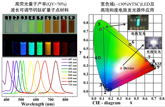 針對顯示應用需求,自2013年開始在國際上率先開展了有機無機雜化鈣鈦礦量子點材料的研究,與董宇平教授等人合作,發現了鈣鈦礦材料的聚集誘導熒光特性(Adv. Opt. Mater. 2015, 3, 112 該期刊2014.07-2015.07閱讀最多的10篇論文之一);利用該特性,建立了室溫再沉淀和微乳液制備鈣鈦礦量子點技術(國際專利申請:PCT/CN2015/092497),獲得了顏色可調、發光效率高的鈣鈦礦量子點材料(見圖2),與華中科技大學韓俊波教授合作,闡明了尺寸減小和有效包覆提高量子點熒光量子產率的物理機制,在此基礎上,展示了高顯色性的寬色域白光LED原型器件(~130% NTSC標準,重合度~96%,ACS Nano 2015, 9 4533,ESI高被引論文,被Materials View China網站和《科學通報》英文版作為亮點報道);與加州大學洛杉磯分校(UCLA)的裴啟兵教授小組合作,實現了高效率的綠光電致發光LED器件,為鈣鈦礦材料的電致發光顯示提供了新技術路線(ACS Appl. Mater. Interface 2015, 7, 28128,該期刊當月閱讀最多的20篇論文之一)。