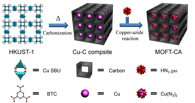 北京理工大學爆炸重點實驗室楊利教授與王博教授合作,首次創新性地實現了以含銅有機框架(MOFs)作為前驅體,通過高溫碳化和氣-固疊氮化反應制備得到一類靜電鈍感的碳-疊氮化銅復合材料。該方法的提出,有效地借用了MOFs中的結構特點,有機配體和金屬離子或團簇的排列具有明顯的方向性,可以形成不同的框架孔隙結構。選取含銅離子的MOFs材料作為基底,通過碳化的方式使得配體結構中的原子轉變為碳原子,其結構仍會保持原有結構中的原子排序與多孔性能的存在。這種多孔性能的極大優勢是使得該化合物在進行疊氮化反應時更加完全,避免了部分未發生疊氮化反應即保留著銅原子本身而影響疊氮化銅的起爆威力,也避免了在疊氮化過程中產生疊氮亞銅,增加起爆藥的不安全因素。原有結構中的原子排序有效地隔離了疊氮化銅分子,降低了其在受到外界弱刺激下的敏感程度。