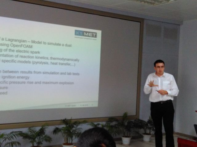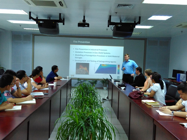 Kern Hannes 教授首先介紹了他所領導的團隊近年來所取得的研究成果,并對工業爆炸安全和應急救援等發展趨勢和科學前沿進行了詳細的闡述。3位博士分別從計算建模、數值模擬和實驗測試等方面分別介紹了不同尺度的粉塵顆粒的擴散、燃燒、爆炸等現象,分析了粉塵爆炸的壓力、溫度隨時間的演變規律。他們的學術研究具有前沿性,研究成果在奧地利的煤礦和化工企業中得到了很好的應用。報告內容詳盡且精彩,贏得了參會師生的強烈興趣,并進行了熱烈的討論。