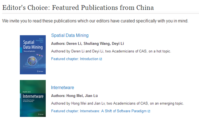 近日,全球領(lǐng)先的從事科研、教育和專(zhuān)業(yè)出版的機(jī)構(gòu)Springer(施普林格)在與Nature(自然)合并為Springer Nature后,推出“聚焦中國(guó)科研”特輯,旨在讓世界全面了解中國(guó)科研領(lǐng)域的最新學(xué)術(shù)研究及著作。由北京理工大學(xué)梅宏院士擔(dān)任第一作者的著作《Internetware》(《網(wǎng)構(gòu)軟件》,同領(lǐng)域代表出版物排名第2)、王樹(shù)良教授擔(dān)任第二作者的著作《Spatial Data Mining》(《空間數(shù)據(jù)挖掘》,同領(lǐng)域代表出版物排名第1)入選該特輯中計(jì)算機(jī)科學(xué)高影響力著作。