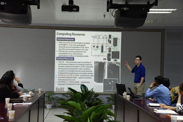 報告中,Hng Huey Hoon教授介紹了新加坡南洋理工大學含能材料研究所的基本情況、研究方向以及未來的發展規劃,并明確提出希望能與實驗室進行長期的學術交流與全面合作。Sreekumar Pisharath博士從含能材料的分子設計、制備與感度性能等多方面介紹了團隊的工作成果,其中對于含鋁炸藥的包覆結構、納米化CL-20炸藥、高能粘合劑GAP的分子結構改進、高氮化合物的合成等進行了詳細的闡述;Seng Yeow Sing博士從化學反應機理模型、爆炸物燃燒性能的預測、沖擊作用過程中的熱動力學模型等方面進行了講解。報告內容引起了在場師生的強烈興趣,并進行了深入的交流與討論。