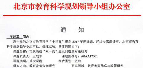 2017年6月6日,北京市教育科學(xué)規(guī)劃領(lǐng)導(dǎo)小組審批立項了北京市教育科學(xué)“十三五”規(guī)劃2017年度重大課題。北京理工大學(xué)研究生教育研究中心主任、教育研究院學(xué)術(shù)委員會主任王戰(zhàn)軍教授獲批《市屬高校“雙一流”建設(shè)問題及對策研究》重大課題,是本年度批準(zhǔn)的唯一一項重大課題,也是北理工在哲學(xué)社會科學(xué)研究領(lǐng)域的新突破。王戰(zhàn)軍教授領(lǐng)銜的課題團(tuán)隊是由北京理工大學(xué)、北京工業(yè)大學(xué)、首都師范大學(xué)等部屬高校和市屬高校研究人員聯(lián)合組成,課題成員結(jié)構(gòu)合理,有較強(qiáng)的研究實力和研究基礎(chǔ)。