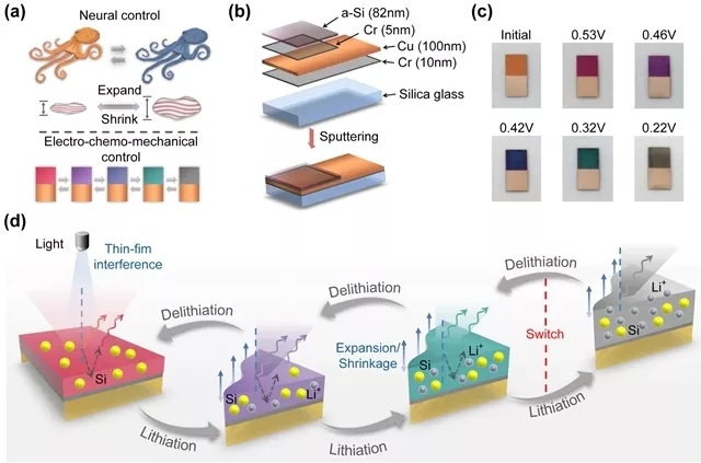 大自然中有多種能夠自適應變色偽裝的生物,以章魚為例,當外界環境發生改變時,章魚能夠通過主動調控皮膚細胞中蛋白質的體積來改變光在不同界面的相位差,從而實現皮膚變色。方岱寧課題組通過設計具有穩定可逆膨脹的硅膜電極,模仿章魚皮膚變色機理,巧妙地利用嵌鋰電位(<1 V),精確控制鋰離子在硅薄膜中的脫嵌行為,實現硅膜的高精度體積變化調控,改變硅膜結構對光線反射產生干涉消光條件,獲得一系列絢麗色彩。值得一提的是,調控硅薄膜中的嵌鋰程度,可以實現關閉或開啟光線干擾作用,器件可以實現彩色至銀色的切換功能。