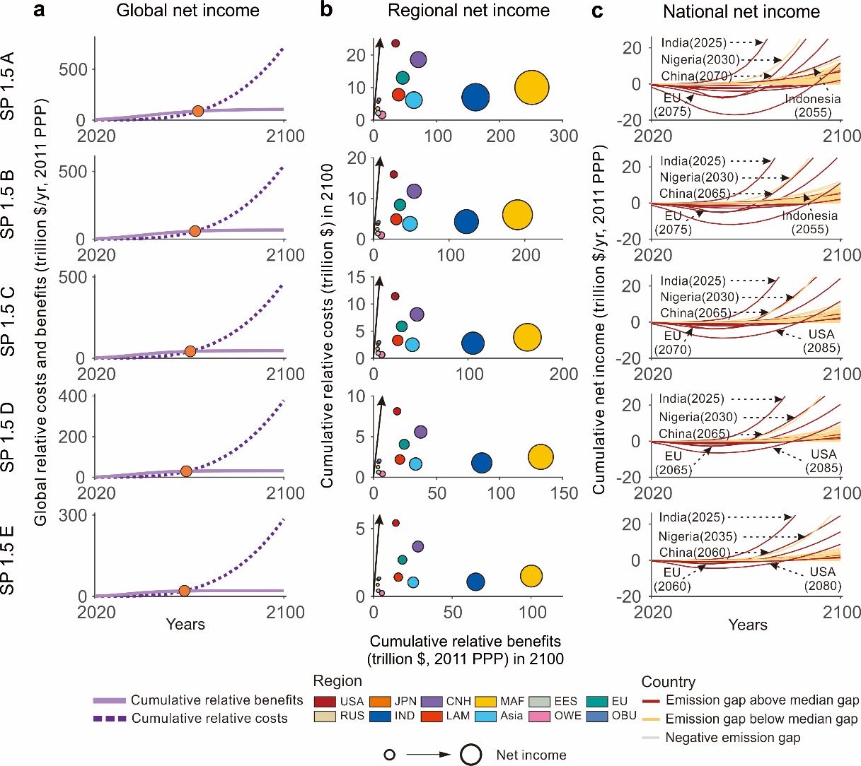 應對氣候變化需要全球各國集體行動。2015年12月,締約方通過《巴黎協定》,并明確了本世紀末將全球溫升控制在不超過工業化前2度的目標,并將1.5度溫控目標確立為應對氣候變化的長期努力方向。《巴黎協定》規定各締約方每五年提交一次“國家自主減排貢獻”(NDC),由各國自主制定減排目標。但現有多數研究表明,國家自主減排貢獻無法滿足2度和1.5度溫控目標的要求。為使NDC與全球溫控目標不斷趨近,《巴黎協定》設置了動態評估機制,要求各國依據自身減排能力逐期增加減排量。然而,出于短期經濟發展考慮,國家或地區可能拒絕增強短期行動力度,這對后巴黎時代全球氣候治理提出了嚴峻挑戰。在此背景下,量化溫控目標下的各國行動方案對應的潛在收益和成本,有助于提高國家應對氣候變化的積極性,推動全球氣候治理進程。