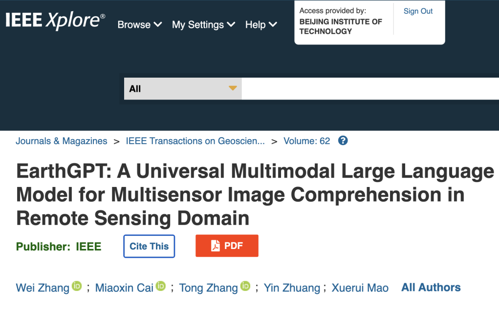 2024年5月,北京理工大學(xué)前沿交叉學(xué)院數(shù)據(jù)流體課題組近日在遙感多模態(tài)大語(yǔ)言模型研究中取得重要進(jìn)展,相關(guān)成果以“EarthGPT: A Universal Multi-modal Large Language Model for Multi-sensor Image Comprehension in Remote Sensing Domain”為題發(fā)表在國(guó)際頂級(jí)期刊《IEEE Transactions on Geoscience and Remote Sensing (TGRS)》上發(fā)表。北京理工大學(xué)為唯一通訊單位,北京理工大學(xué)前沿交叉學(xué)院博士張偉和雷達(dá)技術(shù)研究院博士蔡妙鑫為共同第一作者,毛雪瑞教授為通訊作者。