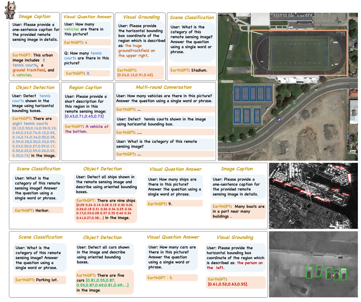 目前遙感領(lǐng)域視覺(jué)模型大多都遵循“一任務(wù)一架構(gòu)”的范式,使得這些專才模型無(wú)法在同一架構(gòu)下統(tǒng)一處理多模態(tài)圖像和多任務(wù)推理。最近,通用多模態(tài)大語(yǔ)言模型(Multi-modal Large Language Models,簡(jiǎn)稱MLLMs)在自然圖像領(lǐng)域取得了顯著成功。然而MLLMs在遙感領(lǐng)域的發(fā)展仍處于起步階段。為填補(bǔ)這一空白,毛雪瑞教授團(tuán)隊(duì)提出了EarthGPT遙感通才模型,將多傳感器圖像理解和多種遙感視覺(jué)任務(wù)都無(wú)縫集成在同一個(gè)框架中。EarthGPT可在自然語(yǔ)言指令下,實(shí)現(xiàn)光學(xué)、合成孔徑雷達(dá)(SAR)圖像和紅外圖像的理解,完成遙感場(chǎng)景分類、圖像描述、視覺(jué)問(wèn)答、目標(biāo)描述、視覺(jué)定位和目標(biāo)檢測(cè)等多種任務(wù)(圖1)。