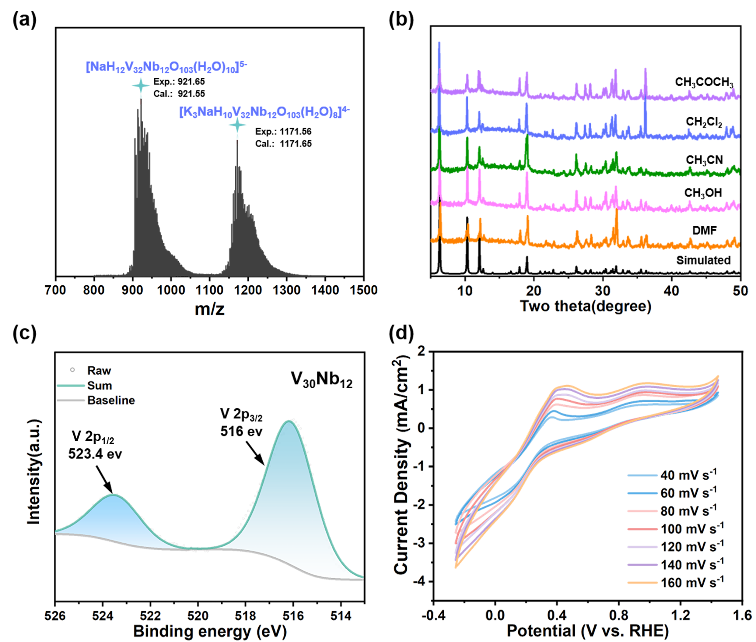 圖4 V30Nb12的ESI-MS、浸泡穩定性、XPS及CV測試。