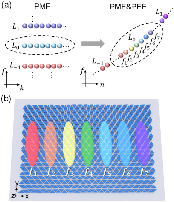 在本工作中,北京理工大學物理學院路翠翠教授課題組和香港大學張霜教授合作,提出同時引入贗磁場(PMF)和贗電場(PEF),其中贗磁場的引入用于產生一系列朗道能級,而贗電場的引入用于打破朗道能級的簡并性,在這兩種人工規范場的協同作用下,同一朗道能級上的不同頻率的朗道模式在空間上分離到不同的位置,呈現出獨特的類似彩虹囚禁的效果,他們將發現的這種物理現象命名為“朗道彩虹”。如圖1所示。