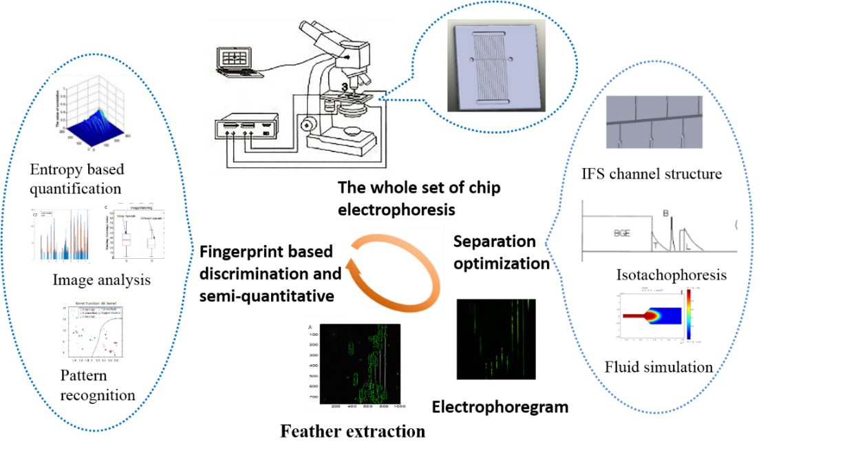 近些年來,針對新發和突發傳染病爆發,未知、部分未知以及不斷突變病原體的快速檢測是及時發現和有效控制傳染病疫情的關鍵之一,課題組利用微流控芯片的高效和集成化優勢,并借助計算機流體動力學模擬仿真,實現了微生物細胞全蛋白微流控芯片多維高通量高分辨電泳分離。進一步分別利用了基于尺度不變特征變換算法的圖像特征提取,全局信息熵和支持向量機等圖像分析技術解析精細電泳分離指紋圖譜,實現了混合樣品中未知微生物的鑒別和半定量分析。(https://doi.org/10.1016/j.chroma.2021.462797)