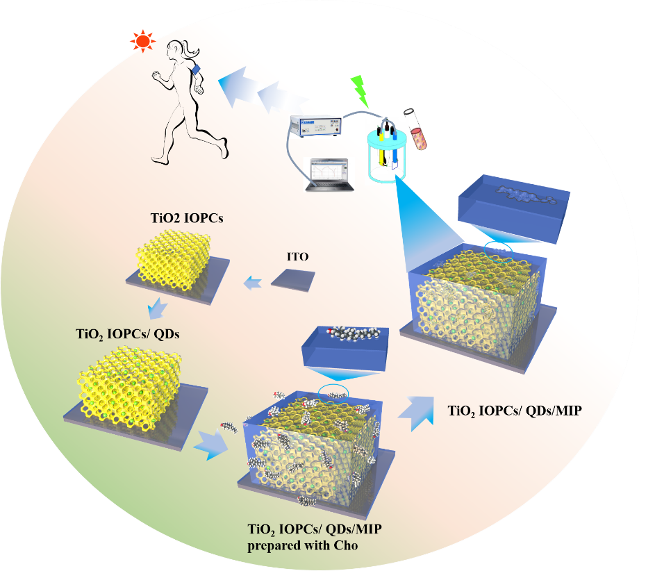 柔性可穿戴智能化健康監測裝置離不開生物傳感器技術的發展。光電化學(PEC)傳感器具有成本低、儀器簡單、易于小型化和高靈敏度的優勢。有機/無機雜化和無機鈣鈦礦新型納米材料因其具有載流子遷移率高、直接帶隙結構、光電轉換效率高等優異的光電性能,在多個領域備受關注。本課題組采用二氧化鈦反蛋白石/鈣鈦礦量子點異質結,同時包裹高選擇性分子印跡聚合物層的策略,不僅建立了能夠應用于水溶液樣品檢測的鈣鈦礦生物傳感器,而且實現了血樣中膽固醇的高選擇性檢測(https://doi.org/10.1016/j.bios.2022.114112) (https://authors.elsevier.com/tracking/article/details.do?aid=132121&jid=SNB&surname=Lina)。在此工作基礎上,本團隊將進一步開展汗液中未知目標的檢測,以建立新型可穿戴智能健康監控裝置。