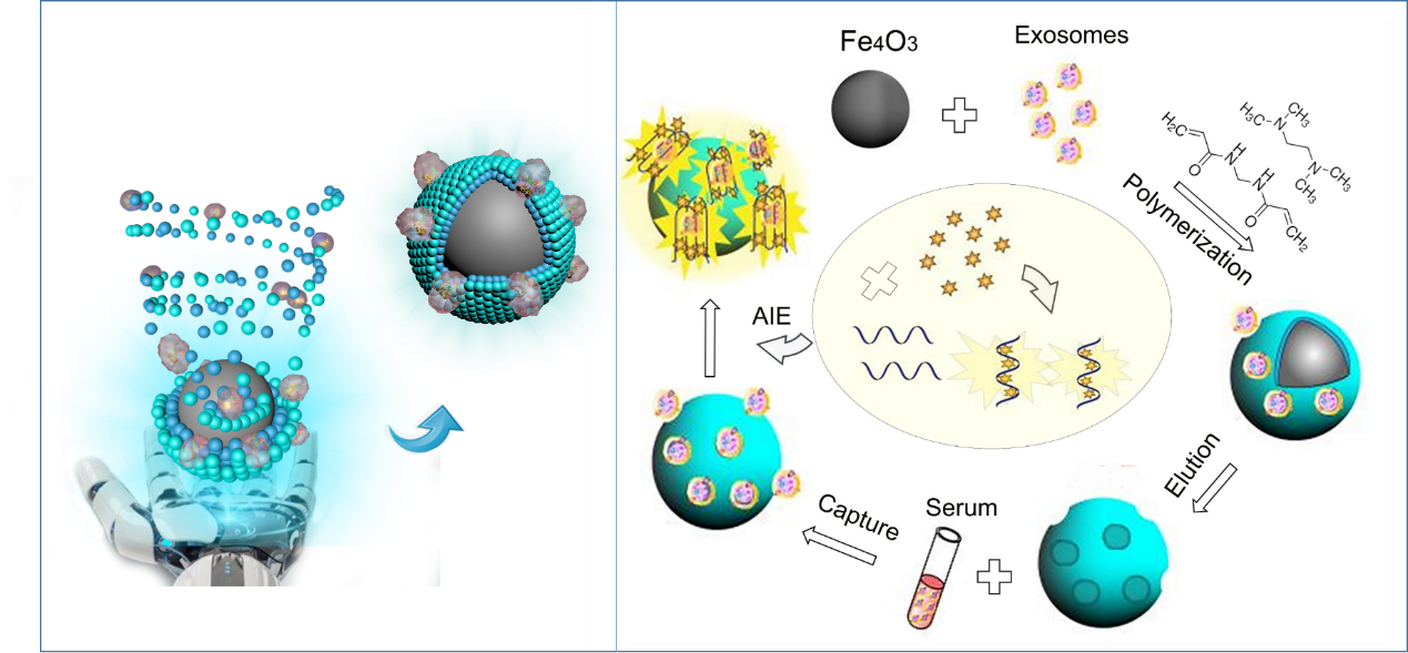 癌細胞來源的外泌體被認為是非侵襲性癌癥診斷的潛在生物標志物之一,然而,不同腫瘤來源外泌體的表面性質尚不完全清楚,類似外泌體這樣的復雜而性質不明的靶點限制了目前廣泛應用的免疫等檢測技術的使用。本課題組借鑒人工智能思路,提出了利用分子印跡技術中的化學自組裝特性,在聚合體系中使用待檢測的目標未知對象進行 “訓練”,借助分子間作用力自組裝搭建三維高選擇高親和性生物識別孔穴,將模板洗脫后,印跡孔穴即可用于未知或模糊目標的識別、分離或檢測。不同于人工智能使用數據自主訓練提取信息完成模型構建,本課題組建立了一種采用實物進行“自主訓練”制備新型人工智能材料的方法。并在此基礎上,分別利用適配體介導的聚集發光材料技術和適配體/石墨烯能量轉移共振技術,建立了兩種“Turn-on”型熒光傳感檢測新技術。外泌體檢測靈敏度優于目前已文獻報道的方法,該方法也初步實現了臨床腫瘤患者血樣和健康人血樣的區分。同時,所建立的基于人工“定制”高選擇性識別材料的方法,可通過簡單地變換“訓練”用模板,進而應用于其他未知目標的檢測,具有普遍適用性。本課題組所建立的方法不僅擴充了分子印跡技術的應用領域,更重要的是提出了一種新型高選擇性未知對象識別技術手段,方法簡便高效,填補了相關技術空白,該方法同時在申請相關專利。(https://doi.org/10.1016/j.snb.2021.131182)(https://doi.org/10.1016/j.bios.2022.114112)。