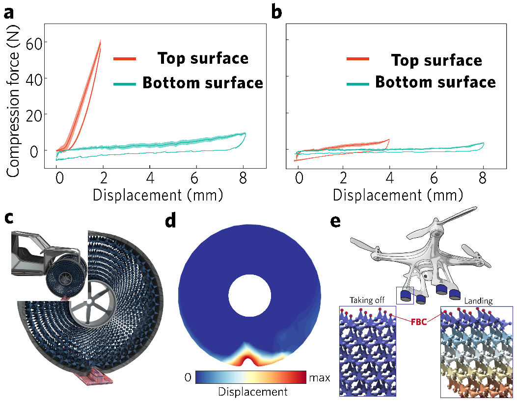 該團隊據此設計了一個三維的“免充氣拓撲輪胎”,如圖4(f,g)所示,廣義焦綠石晶格被嵌入一個圓柱體中,表現為一個多空的免充氣輪胎,并且能夠有效地吸收來自崎嶇地形的沖擊。另外,完全拓撲極化相和外爾相這兩種在剛度表現上具有強烈對比的拓撲相,可以通過整體剪切模式進行簡便地切換。基于這一性質可以設計出在不同場景中表現出不同的剛度性質的材料,例如圖4(e)中所示的無人機起落架,著落過程中材料可以切換為剛度較低的外爾相,有效地吸收沖擊;在飛行過程中則可以切換為完全拓撲極化相,提升無人機外部的剛度來增加穩定性。