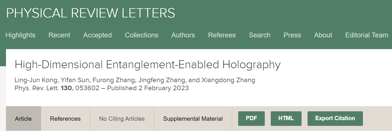 近日,北京理工大學物理學院張向東教授課題組基于高維軌道角動量糾纏態,實現了高維量子全息和圖像安全加密。相關成果以“High-dimensional entanglement-enabled holography”為題發表在國際物理學頂級學術期刊《物理評論快報》[Phys. Rev. Lett. 130, 053602 (2023)]上。北京理工大學物理學院孔令軍研究員、孫亦凡副研究員為該論文的共同第一作者,北京理工大學物理學院張向東教授為論文通訊作者,北京理工大學物理學院張福榮博士、張景風博士也為該工作做出了重要貢獻。該研究工作得到了國家自然科學基金委的大力支持。