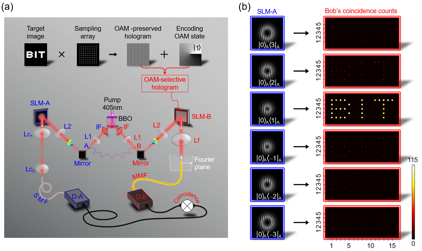 圖1. 高維軌道角動量糾纏量子全息方案示意圖(a)及其測量結果(b)。