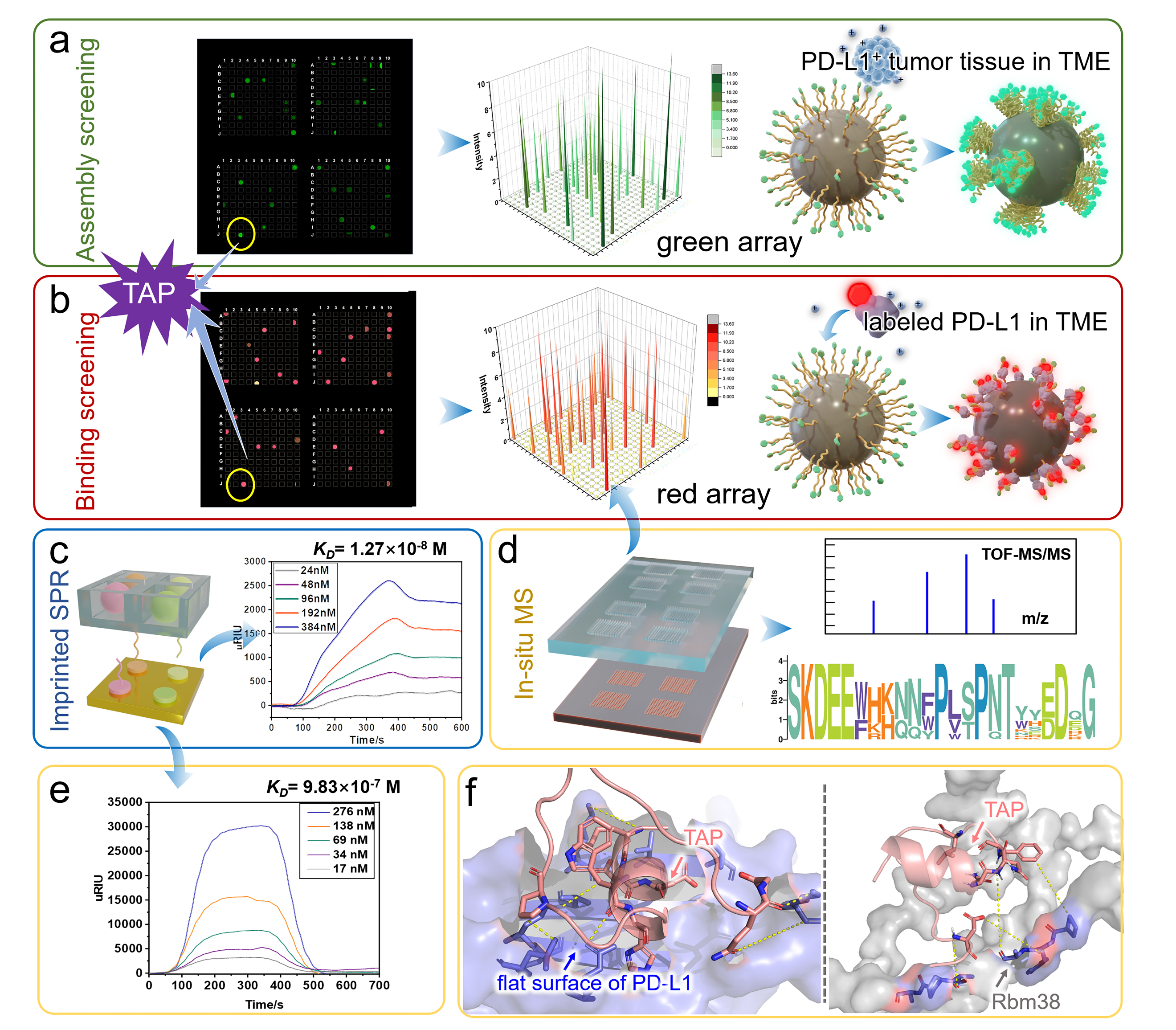首先,通過分析靶標蛋白PD-L1與Rbm38的晶體結構,從頭設計并構筑了容量為105的多肽庫,并在肽庫中引入具有聚集誘導發光(AIE)性能的TPE分子來指示多肽的穩定組裝性能。然后利用微陣列芯片上的三維進化策略在結合能力,自組裝性能以及特異性三個維度進行了肽庫篩選,優化出了一條具有高內涵性能的靶向多肽TAP。