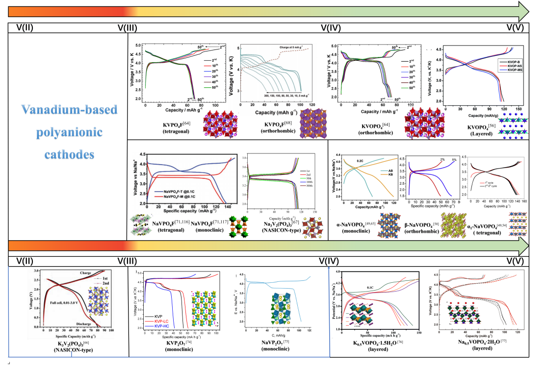 聚陰離子化合物是由MOx(M為過渡金屬)和 (XO4)n?(X="P,S,as,Si,Mo或W)多面體組成的三維開放框架結構。其獨特的結構具有許多的優勢,如:良好的離子擴散動力學、由聚陰離子基團的誘導效應實現的高工作電壓、快速的鈉、鉀離子擴散實現的高能量密度以及聚陰離子框架提供的熱穩定性、安全性,使其在鋰、鈉、鉀離子電池領域中作為正極材料具有非常普遍的應用。研究中對比了相似的聚陰離子正極材料在鈉、鉀離子電池中的不同結構、性能表現上的差異,對于發展高性能聚陰離子正極電池,拓寬和深化其應用領域具有指導意義。基于近年來的諸多研究進展,本綜述圍繞釩基、鐵基、鈦基三種類型的聚陰離子正極材料,較為系統地分析比較了它們在鈉鉀電池中離子嵌入/脫嵌機理、比容量、循環性能、倍率性能等方面的差異,總結和評述了不同材料在鈉/鉀離子電池中的優勢,并對相關挑戰和未來發展趨勢進行了一系列地討論。