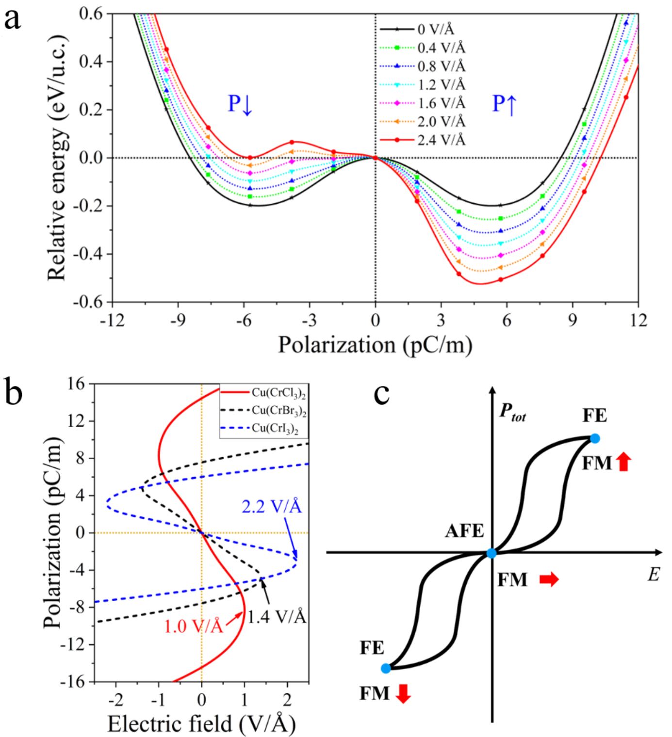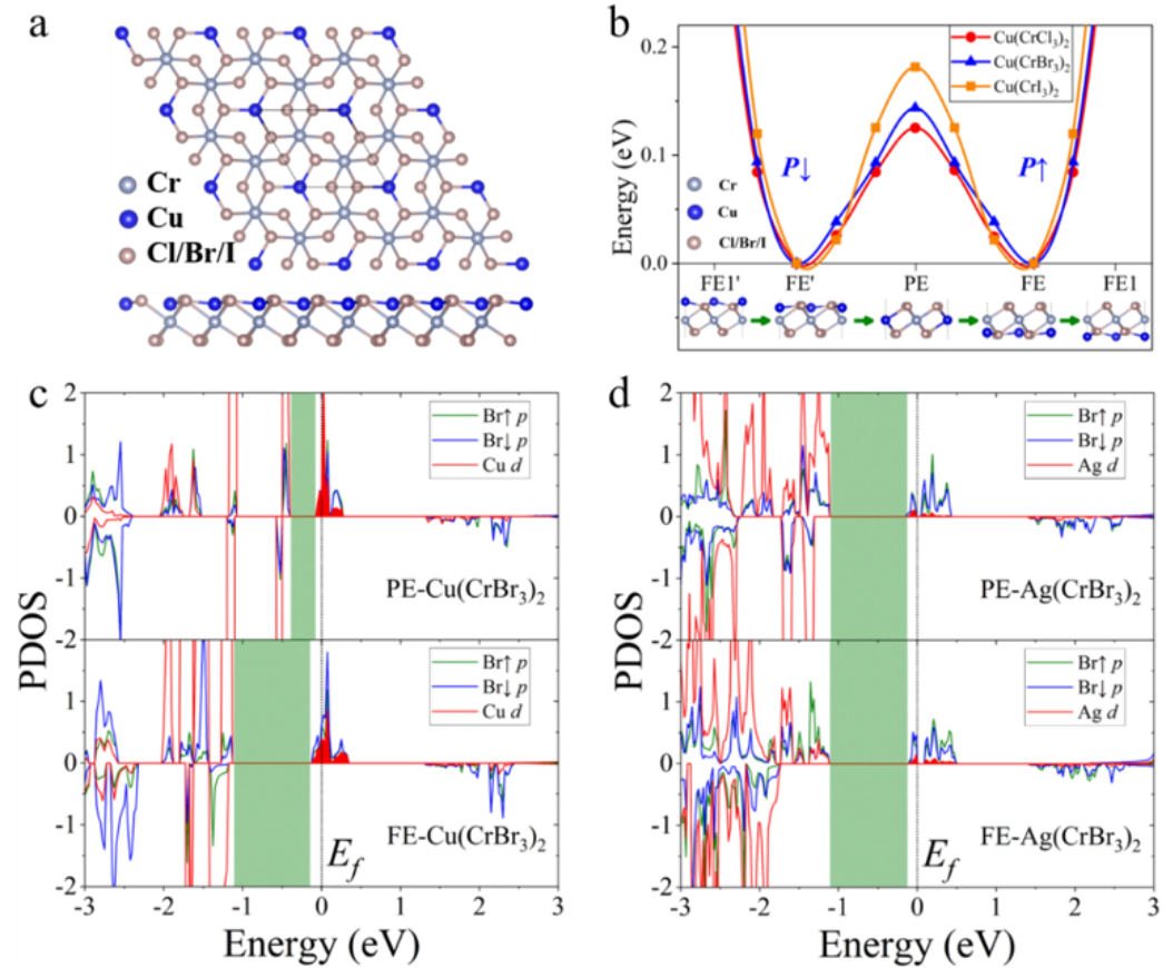 長期以來,人們一直在尋找具有本征多鐵性的二維材料,以實現納米電子器件中磁電耦合的應用。本工作中作者利用過渡金屬原子修飾單層三鹵化鉻實現了單層穩定的Ⅰ型多鐵性,并且其電極化為面外鐵電極化,這有利于外場對其鐵電性的調控。面外鐵電極化表現出較強的原子選擇性,作者發現了84種基于過渡金屬的單層多鐵材料,其中有12種具有面外鐵電或反鐵電極化。通過群論分析揭示了這種現象依賴于p-d耦合和晶體場劈裂。Cu修飾增強了三鹵化物的本征鐵磁性,并且提高了鐵磁轉變溫度。通過計算不同鐵電結構(反鐵電和鐵電)的電極化,作者研究了該系統中的磁電耦合效應。在這些體系中作者獲得了鐵電相和反鐵電相,為磁性材料的外場調控、能量存儲和轉換應用提供了新機遇。此外,作者利用非平衡格林函數方法,計算了雙電極Cu(CrBr3)2器件的輸運性質,結果表明,Cu(CrBr3)2器件具有出色的自旋過濾特性和低偏壓負微分電阻(Negative differential resistance, NDR)效應,具有低功耗的開關響應特性。作者的研究不僅深化了對二維多鐵性材料的認識,預測了多種具有面外鐵電極化的新材料,并揭示了其鐵電性和鐵磁性增強機制,在納米電子和自旋電子器件領域具有廣闊的應用前景。