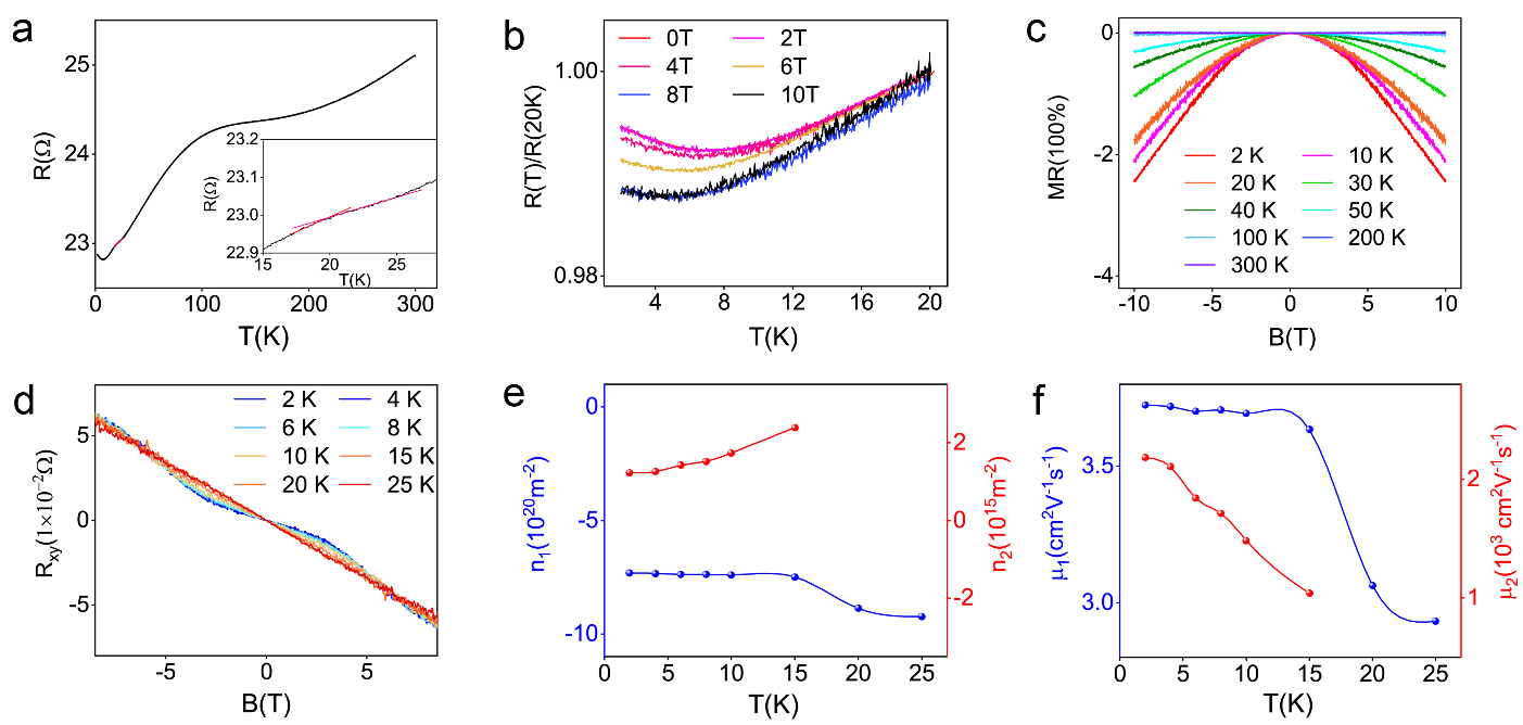 圖5. 二維V3S5晶體的電學性質。(a)電阻隨溫度變化曲線。(b)不同磁場下電阻隨溫度變化曲線。(c)在不同溫度下磁阻變化。(d)不同溫度下霍爾電阻Rxy 隨磁場的變化。(e,f)載流子密度和遷移率隨溫度的變化。
