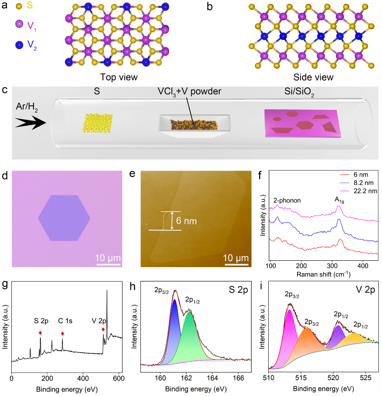 圖1. V3S5晶體的合成和表征。(a,b)V3S5 的原子結構。(c)二維V3S5晶體合成機制。(d)二維V3S5的光學形貌。(e)V3S5的AFM圖。(f)V3S5厚度相關拉曼光譜。(g)二維V3S5 XPS光譜;(h,i)分別為 S 2p 和 V 2p 對應的 XPS 光譜。