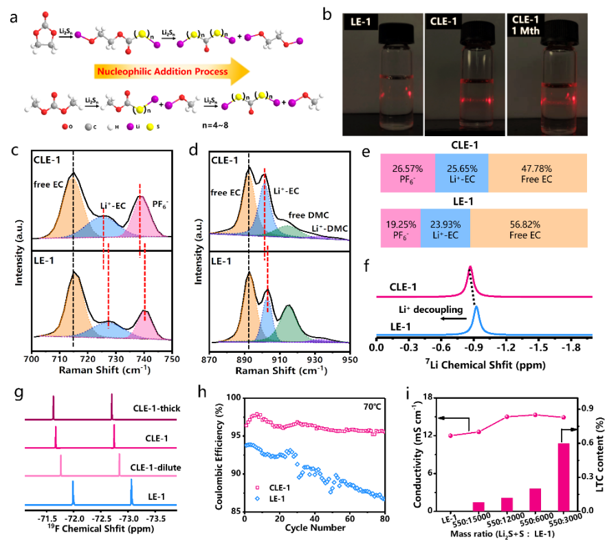 圖1 (a) LTC 添加劑的合成示意圖,(b) 膠體電解質(zhì)的丁達爾現(xiàn)象,(c-d) 商電解質(zhì)和膠體電解質(zhì)的拉曼光譜圖,(e) 液體電解質(zhì)中和膠體電解質(zhì)不同組分的占比,(f) 不同電解質(zhì)的核磁7Li譜,(g) 不同濃度LTC 膠體電解質(zhì)的核磁19F譜,(h)商業(yè)電解質(zhì)和膠體電解質(zhì)組裝Li/NCA電池在70 ℃下循環(huán)的庫倫效率, (i) 不同濃度的LTC與電導(dǎo)率關(guān)系圖。