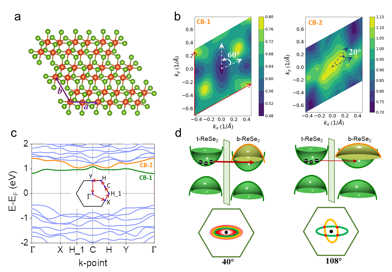 圖1展示的基于1T’-ReSe2的各向異性共振隧穿效應。圖a展示了1T’-ReSe2的原子結構俯視圖,展示了各向異性的晶格方向。圖b展示了計算得到的第一導帶(CB-1,左)和第二導帶(CB-2,右)的能帶圖,顯示了強烈的面內各向異性。圖c 展示了單層ReSe2的能帶結構,顯示導帶最小值位于Γ點。圖d 展示了ReSe2/h-BN/ReSe2 共振隧穿晶體管在40°(左上)和108°(右上)扭轉角度下的能帶對準示意圖。108° 共振隧穿晶體管中的聯合態密度(右下角紅點)低于40°的(左下角紅陰影)。