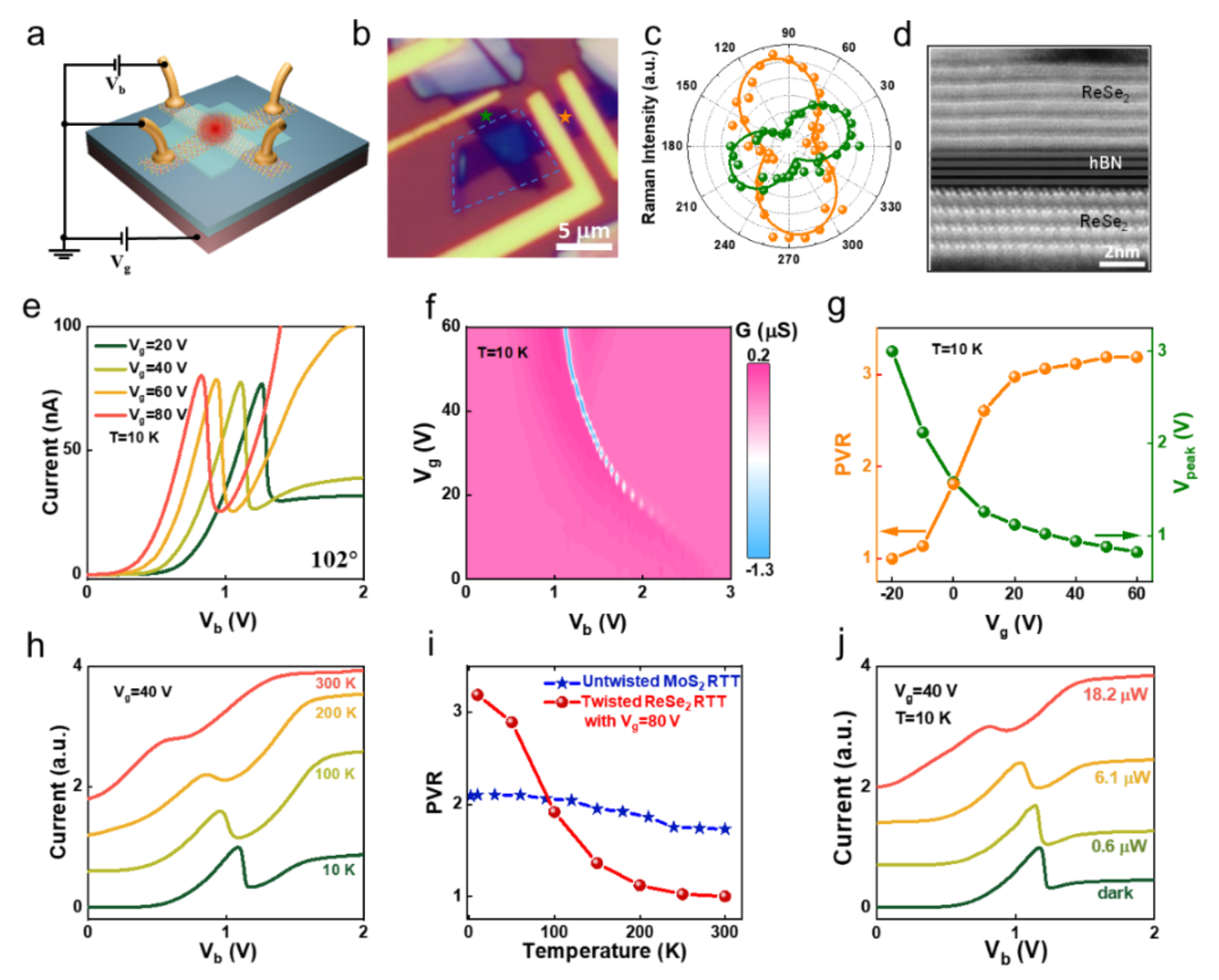 圖2展示了102°扭曲堆疊共振隧穿晶體管中的負微分電阻。圖a展示了ReSe2/h-BN/ReSe2 共振隧穿晶體管的示意圖,其中偏置電壓施加在底層ReSe2上,共振隧穿效應發生在重疊區域(紅色區域所示)。圖b展示了102° 共振隧穿晶體管的光學圖像,橙色和綠色五角星表示拉曼測試的位置。兩層ReSe2通過幾層h-BN(藍色虛線)分隔。圖c展示了在拉曼位移127 cm-1處,頂部(橙色圓圈)和底部(綠色圓圈)ReSe2層的偏振依賴性拉曼強度。擬合線(橙色和綠色線)顯示兩層ReSe2之間的扭轉角度為102°。圖d展示了共振隧穿晶體管的TEM橫截面圖,顯示兩層ReSe2的相對晶格方向。圖e展示了在不同柵電壓下的隧穿電流與偏置電壓的關系,清楚地展示了柵電壓依賴的負微分電阻。圖f展示了共振隧穿晶體管的電導圖,顯示了負微分電阻峰值隨柵電壓的變化趨勢。圖g展示了PVR和負微分電阻峰值位置隨柵電壓的變化總結。圖h展示了柵電壓Vg=40 V時不同溫度下的隧穿電流與偏置電壓的關系,顯示出負微分電阻對溫度敏感。圖i展示了102°TS-RTT與基于單層MoS2的未扭曲共振隧穿晶體管之間的溫度依賴PVR比較,未扭曲共振隧穿晶體管對溫度幾乎不具有依賴性。圖j展示了在不同激光功率的520 nm光照射下的隧穿電流與偏置電壓的關系,顯示出負微分電阻對光照敏感。