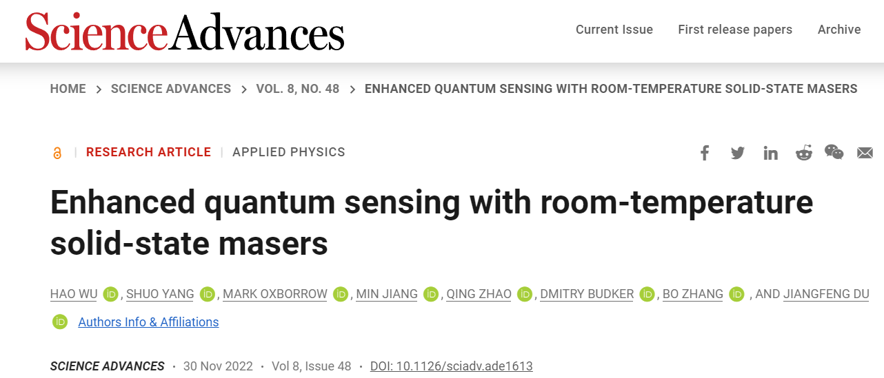文章信息:H. Wu?, S. Yang?, M. Oxborrow, M. Jiang, Q. Zhao, D. Budker, B. Zhang*, J. Du, Enhanced quantum sensing with room-temperature solid-state masers. Sci. Adv. 8, eade1613 (2022).(?為共同一作,*為通訊作者)