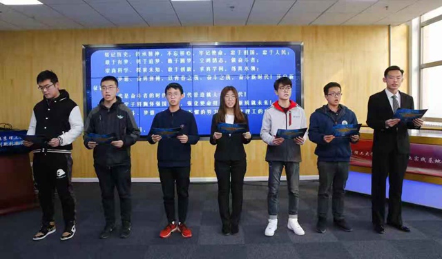 2019年,不僅是建國70周年,也是“五四”運動100周年。讓青春夢與中國夢同頻共振,廣大青年既是追夢者,也是圓夢人,勇作時代前列的奮進者、開拓者、奉獻者,擔負起歷史的重任。在“北理工拓天之路”畫卷前,創新團隊學生代表們進行了青春宣誓?!拔倚模懹洑v史,傳承精神,勇于追夢,敢于創新,擔當作為……”鏗鏘有力的誓言,充分展現了北理工學子敢于奮斗、敢于逐夢、立志報國的精神面貌。