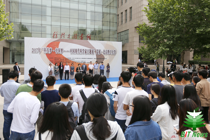 2017年5月8日上午,“科技夢·中國夢——中國現代科學家主題展”巡展(北京理工大學站)啟動儀式在北理工良鄉校區徐特立圖書館舉行。中國科協創新戰略研究院院長羅暉、北京市科協副巡視員兼科普部部長陳維成、北京理工大學紀委書記楊志宏、北京科技咨詢中心主任何素興出席了儀式,北京科技咨詢中心、學校辦公室、黨委宣傳部、良鄉校區管理處、校團委、??茖W技術協會、圖書館等相關單位負責人及師生代表近150人參加了啟動儀式并參觀展覽。儀式由陳維成主持。