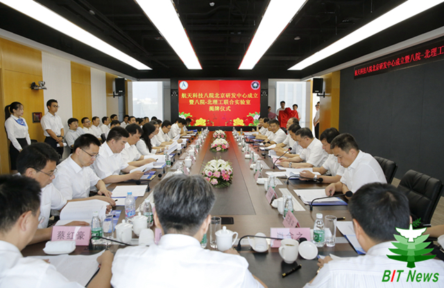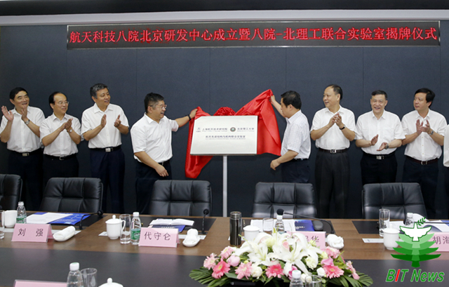 2017年7月7日,上海航天技術研究院(以下簡稱“八院”)北京研發中心暨北理工-八院“航天先進結構與機構”聯合實驗室揭牌儀式在學校國防科技園5號樓舉行。中國航天科技集團公司副總經理楊保華,八院院長代守侖,北京理工大學校長胡海巖院士,副校長陳杰,校長助理、先進結構技術研究院院長楊亞政等出席了揭牌儀式,儀式由八院黨委書記宗文波主持。
