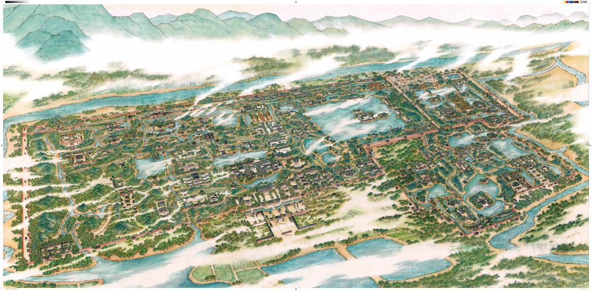《北京周邊山區歷史景觀圖》系“十三五”國家重點圖書規劃項目,是由學苑出版社組織、策劃、出版,原北京市古代建筑研究所、北京大學、清華大學、北京師范大學、北京理工大學、北京建筑大學等科研院所及北京各區文物專家學者共同參與、審定的一項文化工程。階段性項目成果包括景觀圖長卷1幅(幅寬0.6米、長108米),從房山區琉璃河遺址起,至遵化清東陵止;遺產點單幅圖17幅,如云居寺、上方山、頤和園、圓明園、明十三陵、居庸關等,另有解讀圖書、文創產品若干。