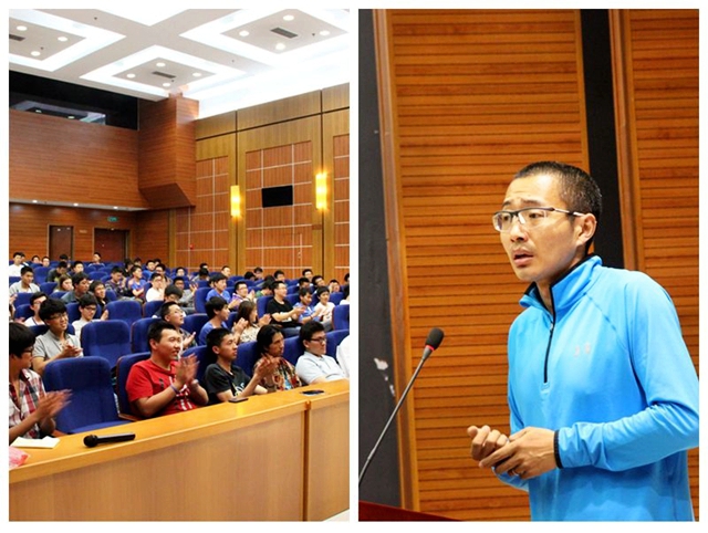 下午三點,于嘉老師穿著一身亮眼的藍色運動裝出現,頗有職業馬拉松運動員的氣質。他的到場也迅速掀起了全場觀眾熱烈的氣氛。講座中,于嘉老師以平實、簡單又不失幽默的語言結合切身的經歷和體驗講述了自己與馬拉松運動的不解之緣。
