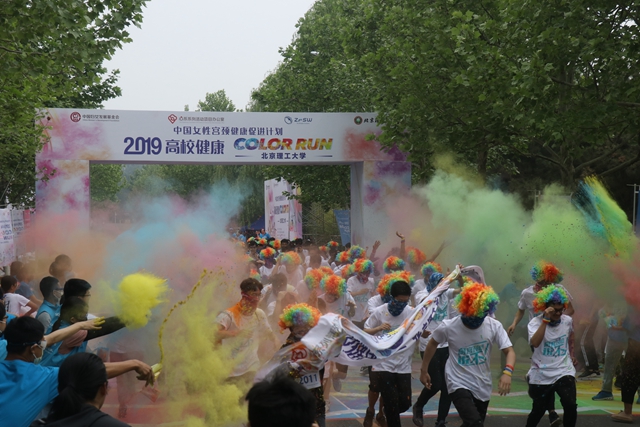 “無色彩、不青春”,比賽第二個環節是“校園彩跑”群眾趣味比賽單元,同學們手持彩跑粉,在藍、粉、綠、黃、紅交疊的彩粉中,盡情奔跑,整個方陣瞬間變得炫麗繽紛,整個賽場沉浸在一片歡快聲中,釋放青春能量,燃動多彩校園。