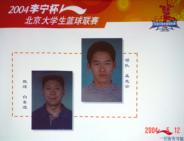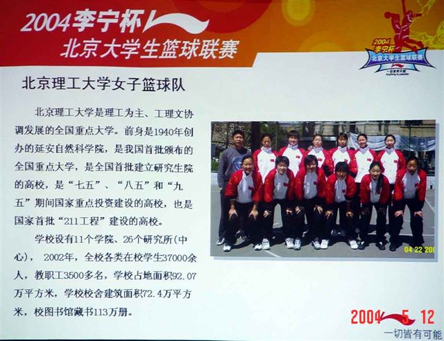 2004年5月12日下午,人民大學(xué)逸夫館,在由北京市體育協(xié)會(huì)和北京大學(xué)生籃球協(xié)會(huì)聯(lián)合主辦、由李寧公司贊助的第八屆北京大學(xué)生籃球聯(lián)賽的新聞發(fā)布會(huì)上,來(lái)自首都11所高校的領(lǐng)導(dǎo)以聯(lián)名籃球的形式宣布新一輪較量開(kāi)始,大學(xué)生運(yùn)動(dòng)員代表更是喊出了“圓夢(mèng)2008,一切皆有可能!”的高校籃球宣言。