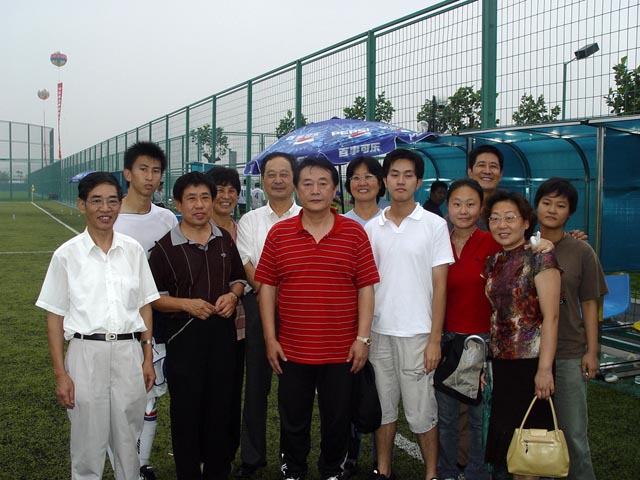 我隊7號球員李爽(左二)的親友團到現場加油助威并與總教練金志揚合影留念。