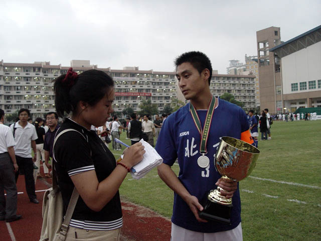 我校足球隊最終榮獲亞軍,這是賽后我方隊長3號姚遠在接受媒體采訪。