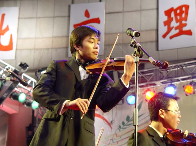 由學生藝術團交響樂團團長周考同學領奏的小提琴協奏曲《梁山伯與祝英臺》選段,包括“草橋結拜”、“英臺抗婚”、“墳前花蝶”三個主要情節,表現了這對青年男女的忠貞愛情和對封建宗法禮教的控訴和反抗。最后化蝶的描寫富于浪漫主義色彩,反映了人民的愿望與理想。
