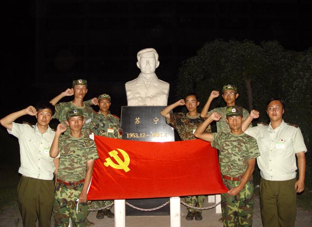 晚間,部分黨員代表請到炮兵指揮學(xué)院教官在蘇寧烈士塑像前介紹英雄事跡